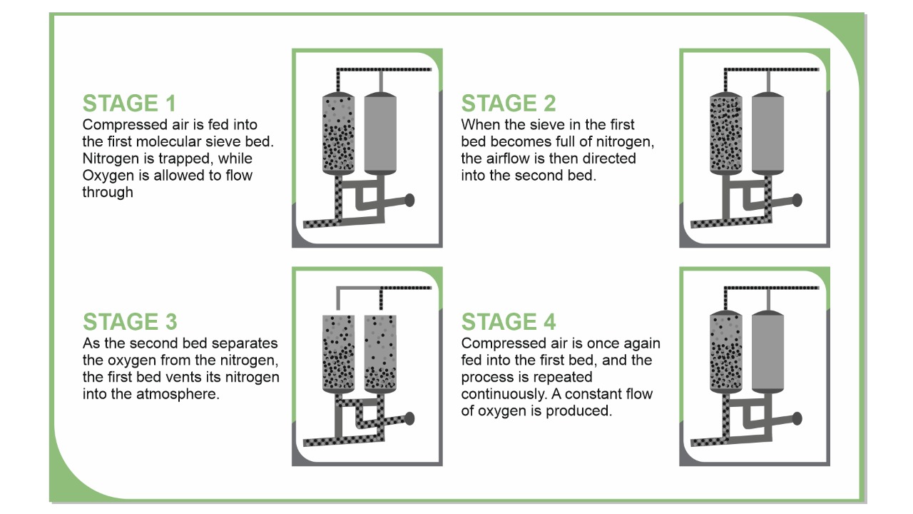 ❖ It uses adsorbents in two columns to separate Molecules of Oxygen from Air, removing Nitrogen and Argon in continuous flow.